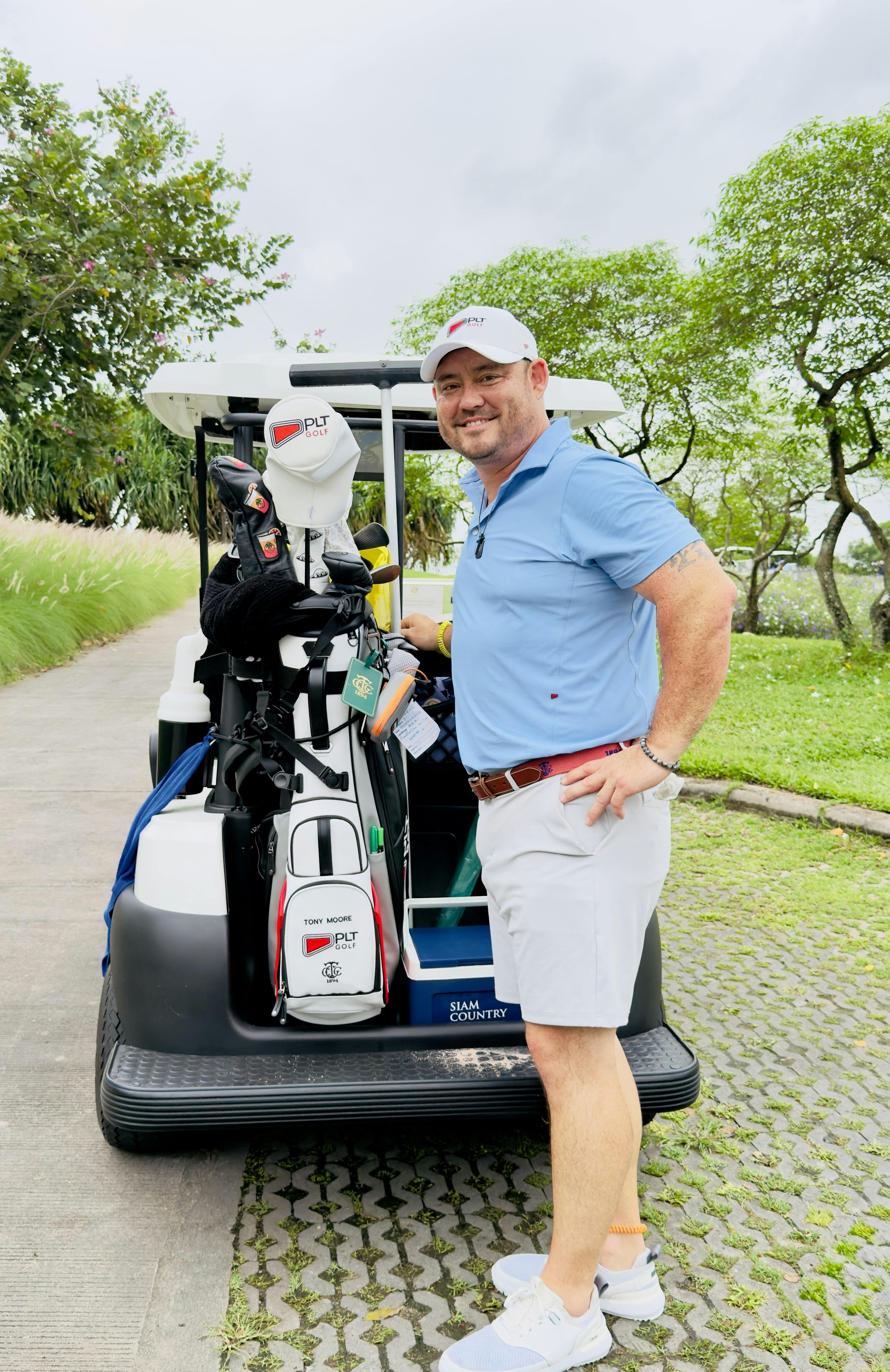 Signature PLT details include a flag enamel pin on the panel seam, stitched placket, and back shoulder logo. Hidden soft collar stays ensure the collar stays crisp, while a slightly longer length keeps the shirt tucked swing after swing.